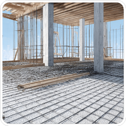 The structure is prepared for concrete to be poured over the reinforcement mesh. which ensures the final slab can handle necessary daily loads and structural stresses. Reinforced concrete columns are visible to support the completed slab structure.